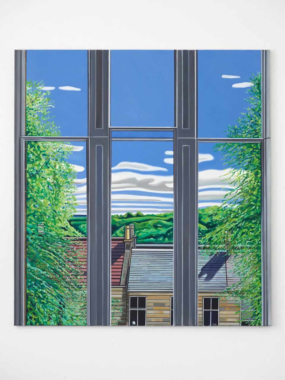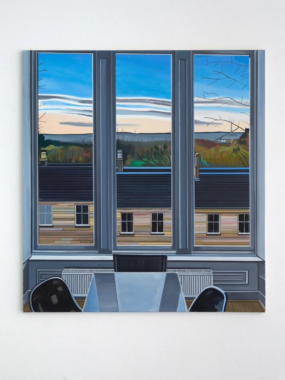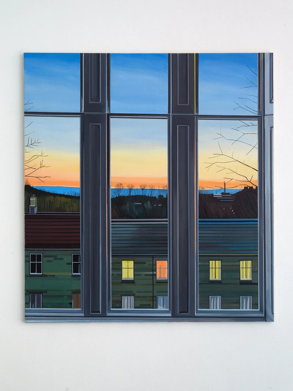 19 Bilder, 22 x 20 Inches, Acryl auf Leinwand. Stellenweise mit bemalter Rückseite, weil mir nach einer Weile die Leinwand ausging und ich vergleichbares Material in Glasgow nicht finden konnte. Also spannte ich alte Bilder ab um deren Rückseite zu bemalen. 19 Fenster, im Wohnzimmer gemalt zwischen Oktober 2017 und September 2018, ohne Fotos, nur Gucken. Je mehr ich schaute, je länger ich malte, desto mehr verstand ich, desto klarer sah ich. Etwas anschauen und dann das Gesehene übersetzen in Pinselstrich und Farbe. Architektur war nie mein Ding in der Malerei, gerade Linien auch nicht. Organisches, Tiere, Menschen, das fand ich spannend. Das .berprüfbare der Perspektive: Wie hoch ist das Fenster, was macht die Regenrinne, wie weit kommen die Äste ins Bild, wo ist der Horizont und warum sieht man da manchmal Windräder und dann wieder nicht? (Mit Brille sieht man sie eigentlich immer). Angefangen habe ich mit zwei Bildern zur gleichen Zeit in der Hoffnung, das beide einander bedingen und verbessern, und ich nicht betriebsblind werde beim Malen. Später dann aber immer nur eins nach dem anderen. An manchem habe ich mir fast die Zähne ausgebissen, Wolken gejagt, die Dämmerung skizziert und dann das Licht angemacht um zu überprüfen (schwierig, weil dann Draußen alles viel dunkler wirkt, als es eigentlich ist). Im März 2018 schneite es und der Schnee blieb auf den Dächern liegen. Ich hatte keinen passenden Keilrahmen, also habe ich ein fertiges Bild abgespannt und den Rahmen für eine neue Leinwand verwendet und während des Malens die ganze Zeit Sorge gehabt, das Resultat könnte aussehen wie ein Adventskalenderbild.