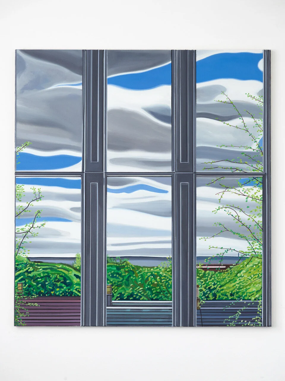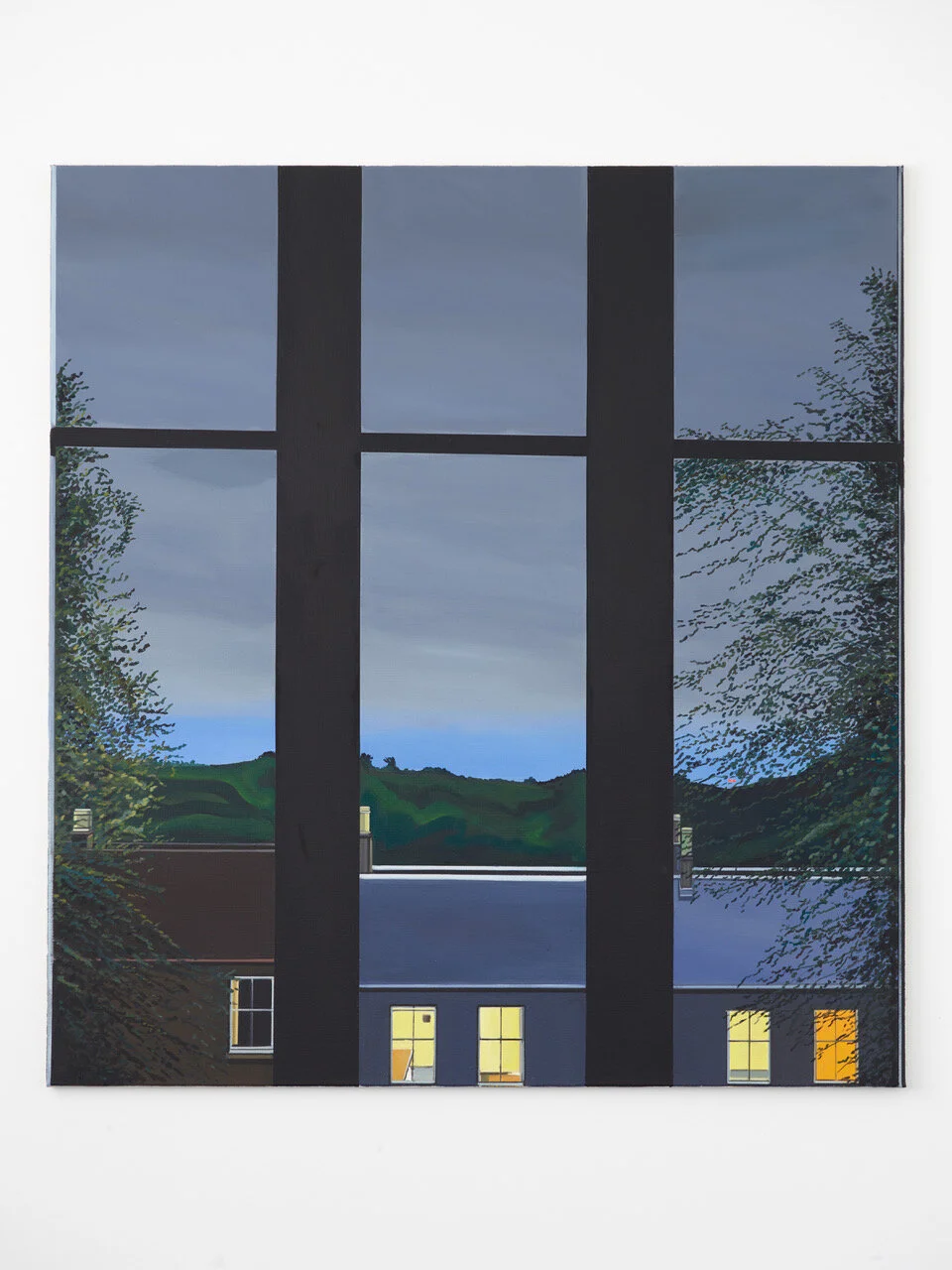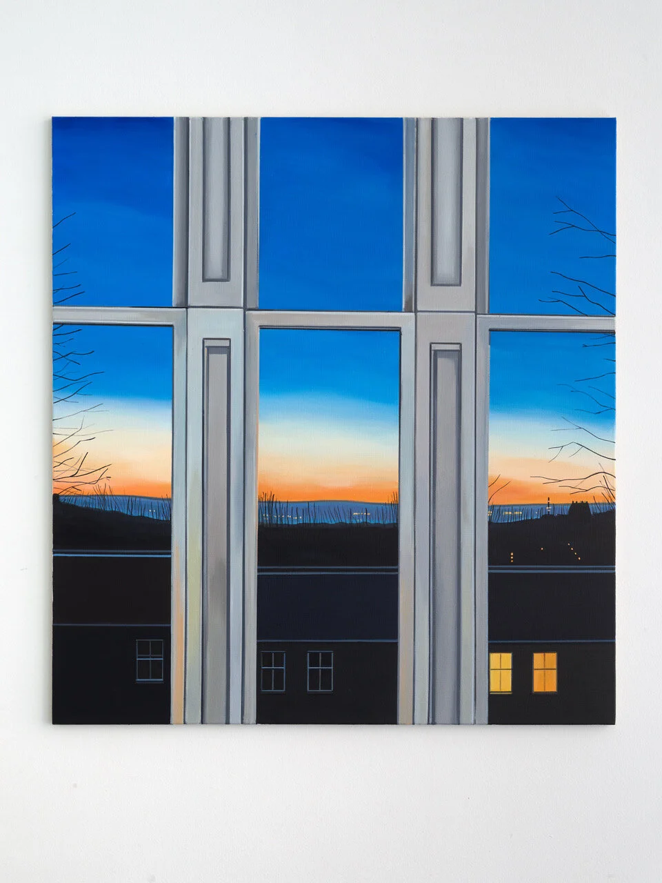 19 Bilder, 22 x 20 Inches, Acryl auf Leinwand. Stellenweise mit bemalter Rückseite, weil mir nach einer Weile die Leinwand ausging und ich vergleichbares Material in Glasgow nicht finden konnte. Also spannte ich alte Bilder ab um deren Rückseite zu bemalen. 19 Fenster, im Wohnzimmer gemalt zwischen Oktober 2017 und September 2018, ohne Fotos, nur Gucken. Je mehr ich schaute, je länger ich malte, desto mehr verstand ich, desto klarer sah ich. Etwas anschauen und dann das Gesehene übersetzen in Pinselstrich und Farbe. Architektur war nie mein Ding in der Malerei, gerade Linien auch nicht. Organisches, Tiere, Menschen, das fand ich spannend. Das .berprüfbare der Perspektive: Wie hoch ist das Fenster, was macht die Regenrinne, wie weit kommen die Äste ins Bild, wo ist der Horizont und warum sieht man da manchmal Windräder und dann wieder nicht? (Mit Brille sieht man sie eigentlich immer). Angefangen habe ich mit zwei Bildern zur gleichen Zeit in der Hoffnung, das beide einander bedingen und verbessern, und ich nicht betriebsblind werde beim Malen. Später dann aber immer nur eins nach dem anderen. An manchem habe ich mir fast die Zähne ausgebissen, Wolken gejagt, die Dämmerung skizziert und dann das Licht angemacht um zu überprüfen (schwierig, weil dann Draußen alles viel dunkler wirkt, als es eigentlich ist). Im März 2018 schneite es und der Schnee blieb auf den Dächern liegen. Ich hatte keinen passenden Keilrahmen, also habe ich ein fertiges Bild abgespannt und den Rahmen für eine neue Leinwand verwendet und während des Malens die ganze Zeit Sorge gehabt, das Resultat könnte aussehen wie ein Adventskalenderbild.